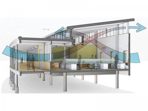 Wlot powietrza nawiewnego z zewnątrz przypada na szereg kratek, zazwyczaj umieszczonych w pokojach dziennych (jadalnie, gabinet, salon i sypialnie), gdzie produkcja wilgoci i zanieczyszczeń jest niższa. To rozwiązanie ogranicza również możliwości filtracji napływającego powietrza, zapobiegając jego ogrzewaniu. Wewnętrzna recyrkulacja powietrza odbywa się przez otwory między pomieszczeniami.